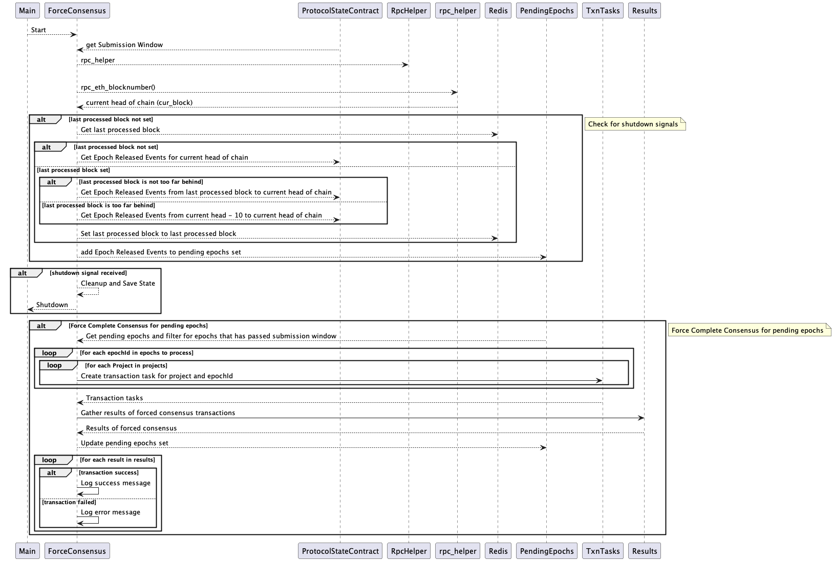 The Force Consensus service operates slightly differently than the Epoch Generator and is heavily optimized to handle a large number of projects. The sequence diagram explaining the flow is given below.